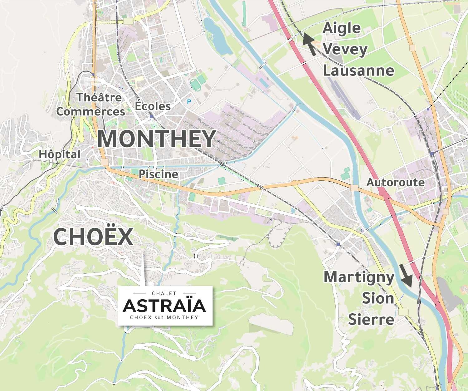 L'accès à l'autoroute se fait en 8 minutes, et il faut 5 minutes pour atteindre les commerces et les infrastructures du centre de Monthey. Une fois sur l'autoroute, Vevey est à 25 minutes et Sion se trouve à 30 minutes.